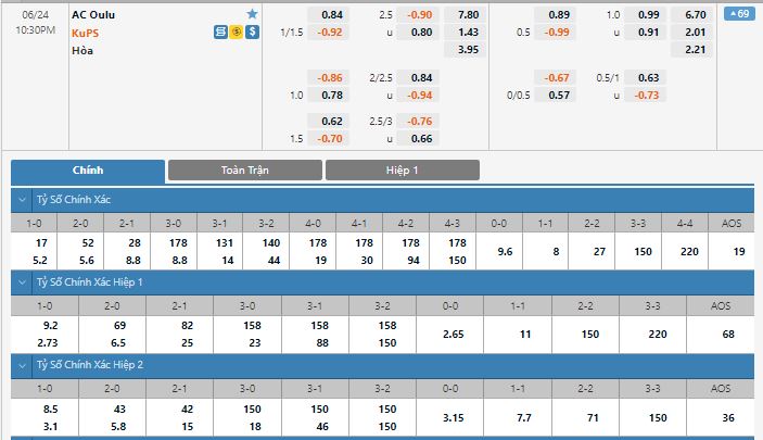 Bảng tỷ lệ kèo trực tuyến trận đấu AC Oulu vs KuPS: