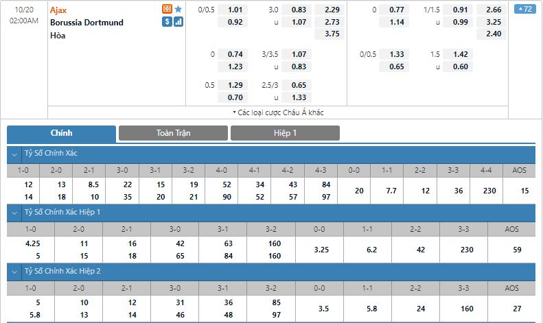 Bảng tỷ lệ kèo bóng đá Ajax vs Borussia Dortmund