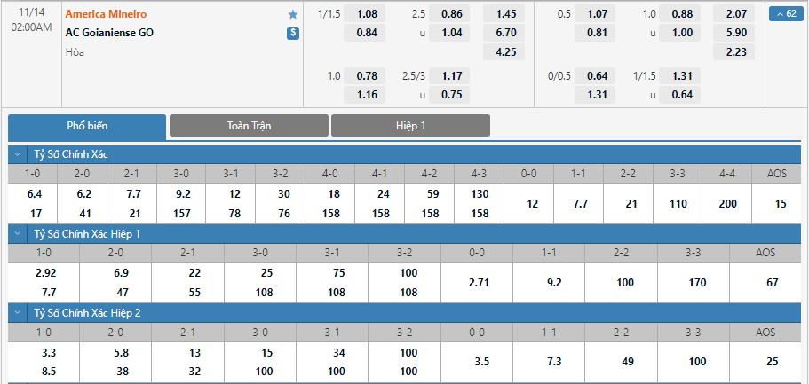 Bảng tỷ lệ kèo trực tuyến trận America MG vs Atletico GO