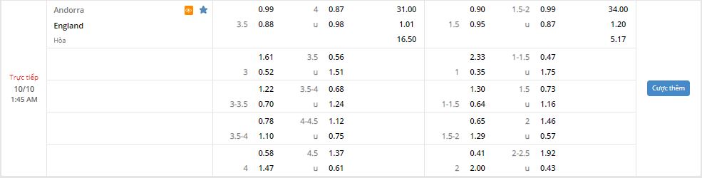 Bảng tỷ lệ kèo trực tuyến trận đấu Andorra vs Anh