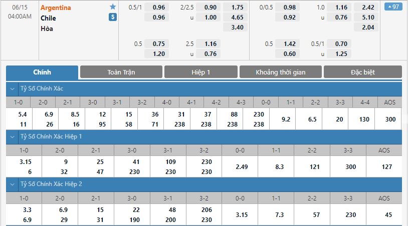 Bảng tỷ lệ kèo bóng đá Argentina vs Chile
