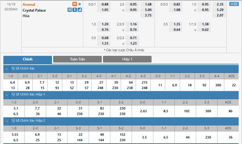- Kèo tỉ số hiệp 1: Arsenal 1-0 Crystal Palace