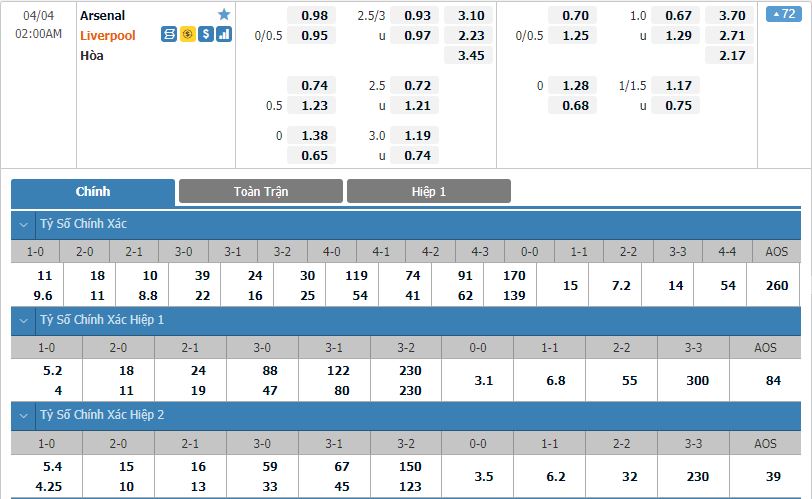Bảng tỷ lệ kèo bóng đá Arsenal vs Liverpool