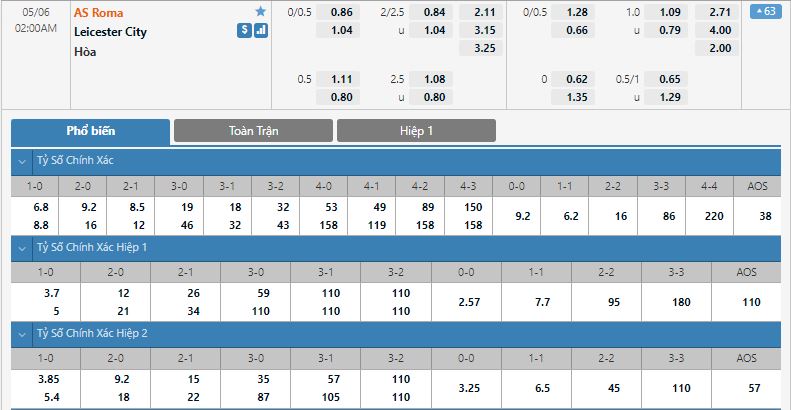 - Kèo tỉ số hiệp 1: AS Roma 0-0 Leicester