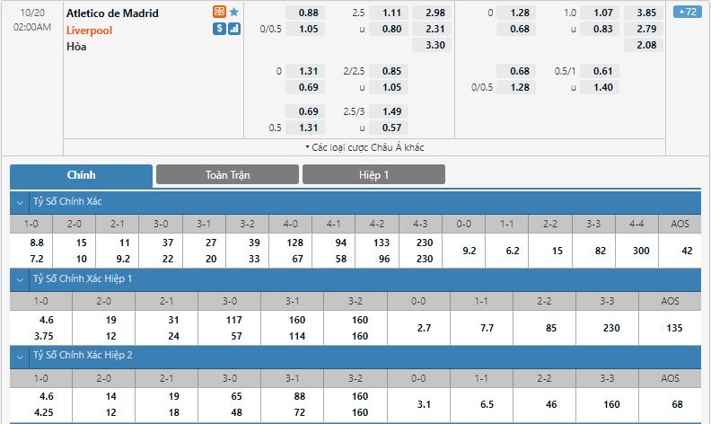 - Kèo tỉ số hiệp 1: Atletico Madrid 0-0 Liverpool