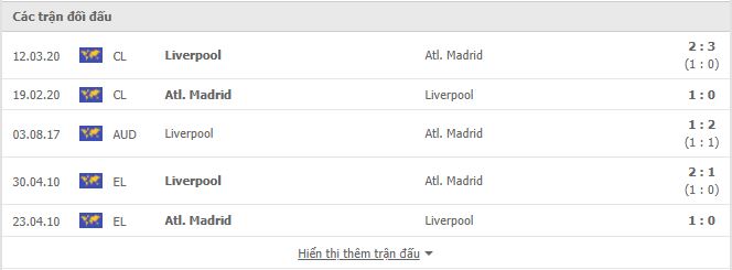 Thành tích đối đầu Atletico Madrid vs Liverpool