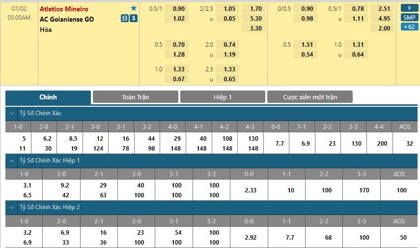 Bảng tỷ lệ kèo trực tuyến trận đấu Atletico-MG vs Atletico Goianiense: