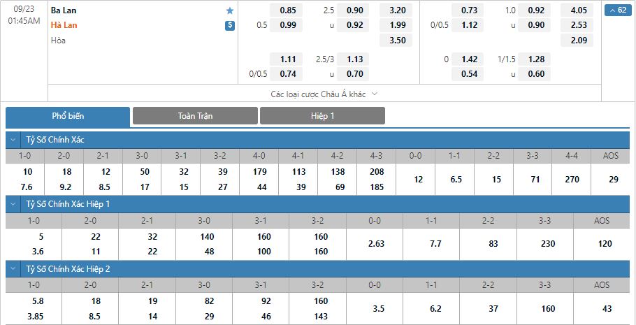 Bảng tỷ lệ kèo trực tuyến trận đấu Ba Lan vs Hà Lan