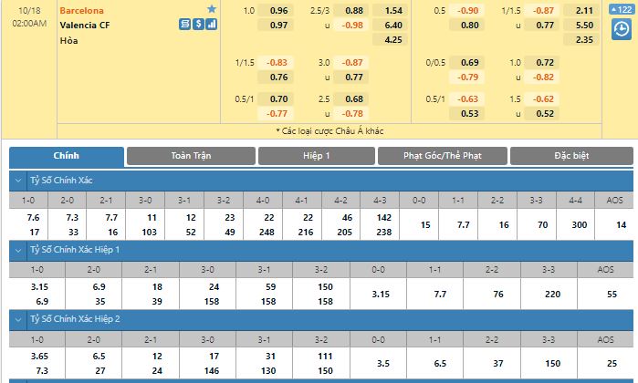 Bảng tỷ lệ kèo trực tuyến trận đấu Barcelona vs Valencia: