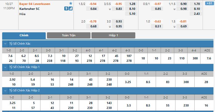 Bảng tỷ lệ kèo trực tuyến trận đấu Bayer Leverkusen vs Karlsruher: