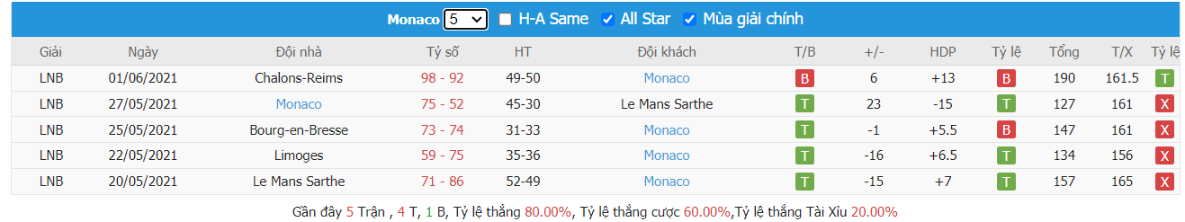 Thống kê cũng chỉ ra hệ thống phòng ngự của AS Monaco Basket đang là “lổ hỏng” của đội khách khi đã bị mất trung bình tới 91 điểm mỗi trận trong tổng số 3 trận ra sân trên sân khách đã qua. Như vậy đây tiếp tục là một lợi thế với những hậu vệ dẫn banh xuất sắc của đội chủ nhà khi mà BCM Gravelines-Dunkerque đã ghi được tới 85 điểm trong trận đón khách mới đây nhất. Như vậy cửa tài vẫn sẽ là sự lựa chọn sáng hơn với giới đầu tư ở trận tới, nhất là khi mà AS Monaco Basket đã có tới 4 trên 6 lần ra sân gần nhất ghi nhận được kết quả chung cuộc nổ tài. Đồng thời cũng có tới 3 trên 4 trận gần nhất mà BCM Gravelines-Dunkerque đã tiếp đón chính AS Monaco Basket cũng có kết quả tương tự.