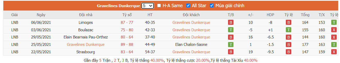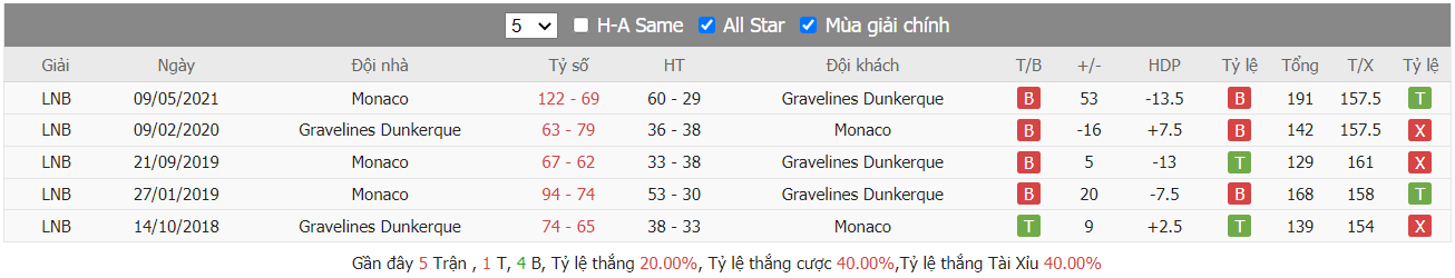 Thống kê về thành tích đối đầu của hai đội trong quá khứ, kết quả cho thấy với lợi thế được ra sân ngay trên sân nhà ở trận đấu tới BCM Gravelines-Dunkerque hoàn toàn được đánh giá cao hẳn khi đã giành được tuyệt đối tới 6 thắng lợi trên tổng số 8 lần so tài gần nhất của hai bên trong quá khứ kể từ 12/2016 cho đến nay, trong đó cũng đã có tới 5 trận được diễn ra trên sân của BCM Gravelines-Dunkerque. Trong số đó ở lần gặp nhau gần nhất của hai đội được diễn ra hồi tháng 2 vừa qua, khi đó với lợi thế sân nhà BCM Gravelines-Dunkerque đã giành được thắng lợi 87 – 83 khi tiếp đón AS Monaco Basket ngay trên sân nhà. Như vậy thấy rõ với lợi thế sân nhà ở trận tới BCM Gravelines-Dunkerque chính là lựa chọn sáng hơn hẳn dành cho giới đầu tư ở trận tới.