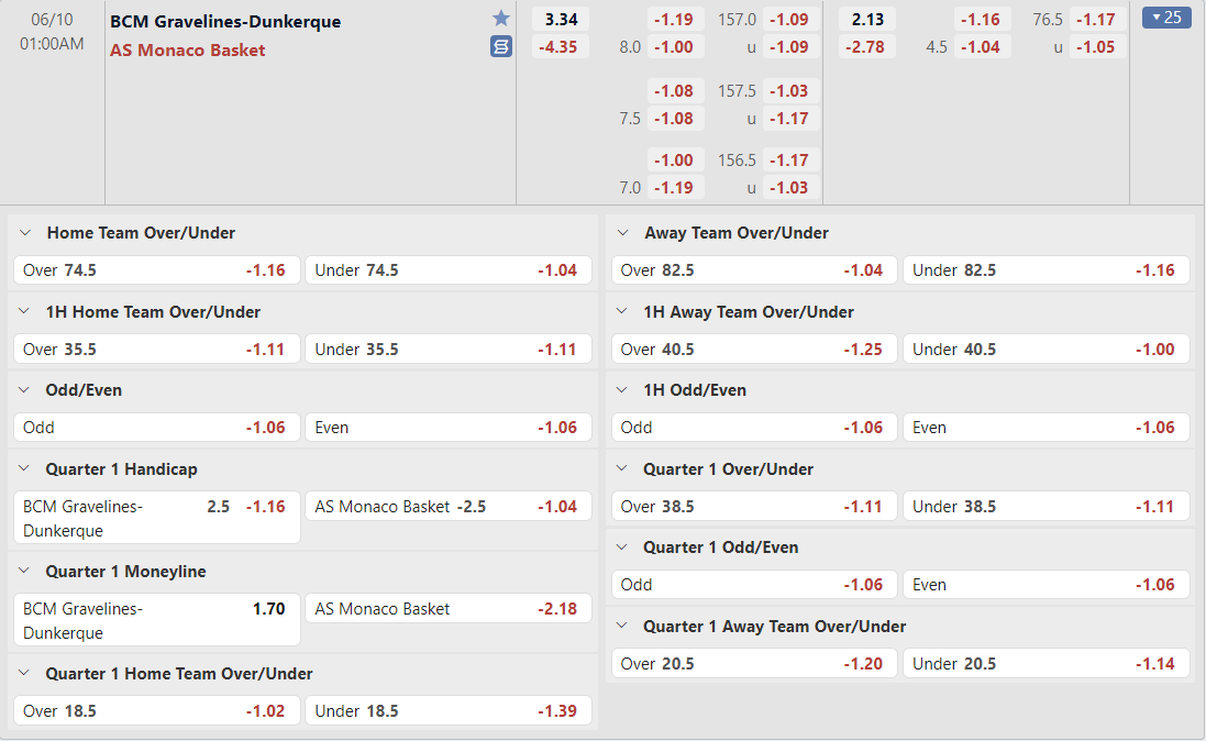Bảng tỷ lệ kèo BCM Gravelines-Dunkerque vs AS Monaco Basket