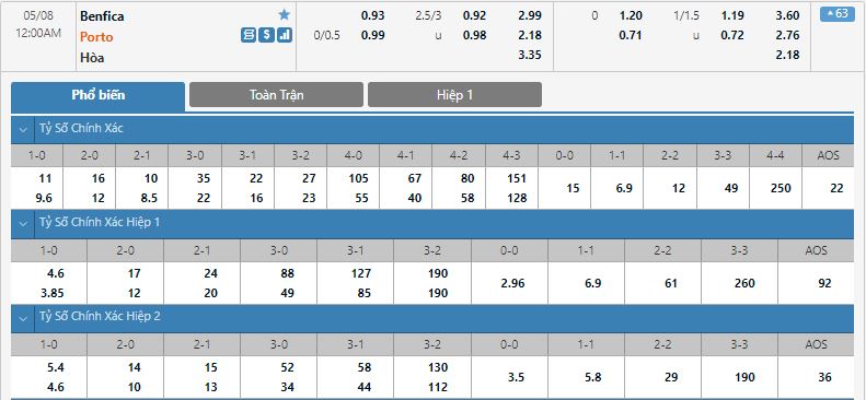 Bảng tỷ lệ kèo bóng đá Benfica vs FC Porto