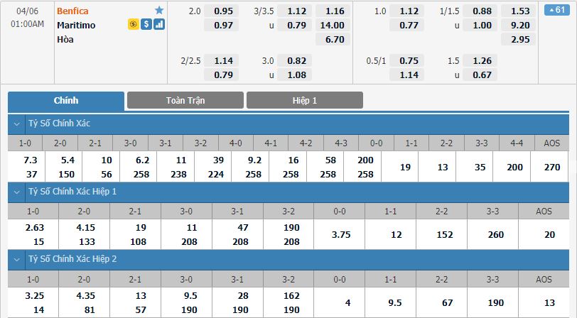 - Kèo tỉ số hiệp 1: Benfica 1-0 Maritimo