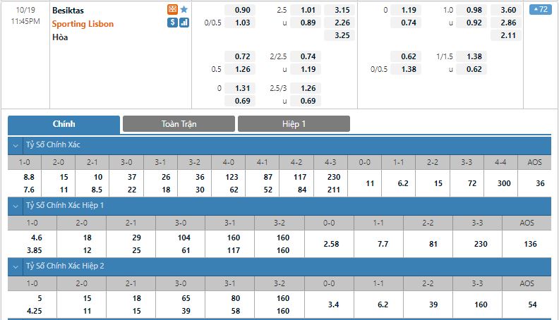 Bảng tỷ lệ kèo bóng đá Besiktas vs Sporting CP