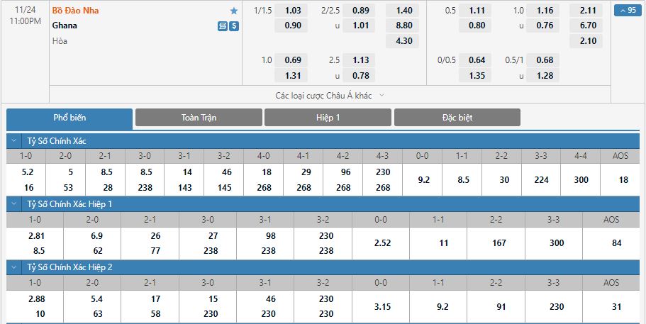 Bảng tỷ lệ kèo trực tuyến trận Bồ Đào Nha vs Ghana