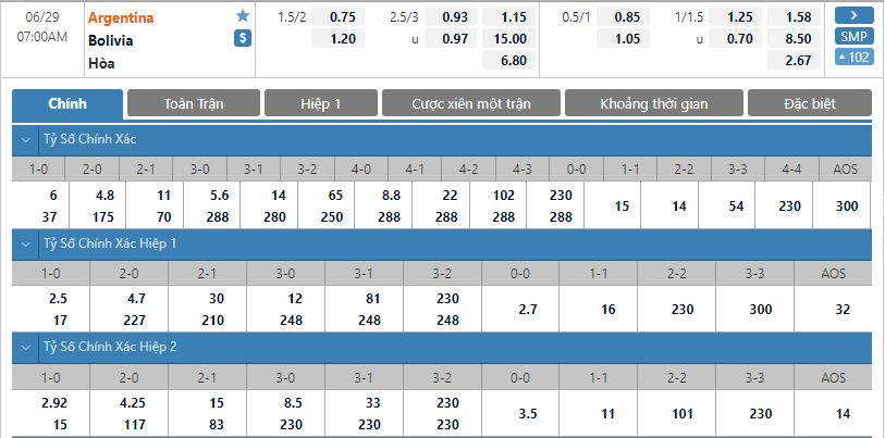 Bảng tỷ lệ kèo trực tuyến trận đấu Bolivia vs Argentina