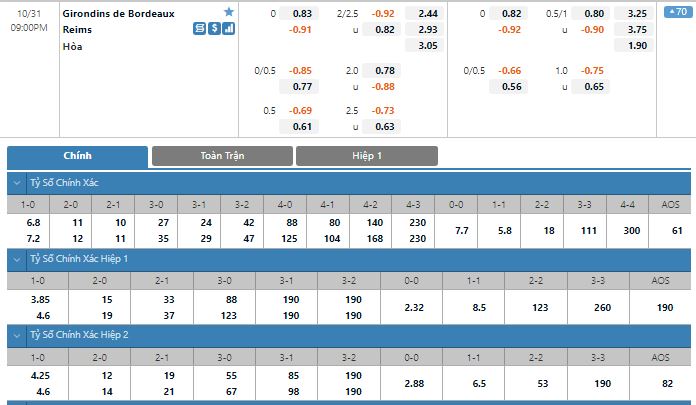 Bảng tỷ lệ kèo trực tuyến trận đấu Bordeaux vs Reims: