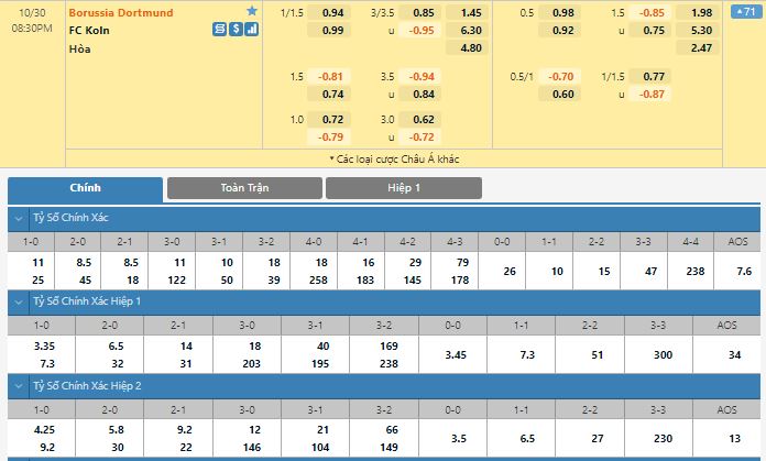 Bảng tỷ lệ kèo trực tuyến trận đấu Borussia Dortmund vs FC Koln: