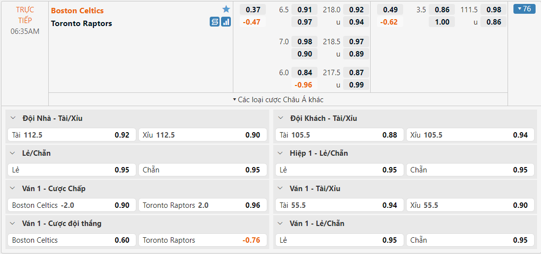 Bảng tỷ lệ kèo Boston Celtics vs Toronto Raptors