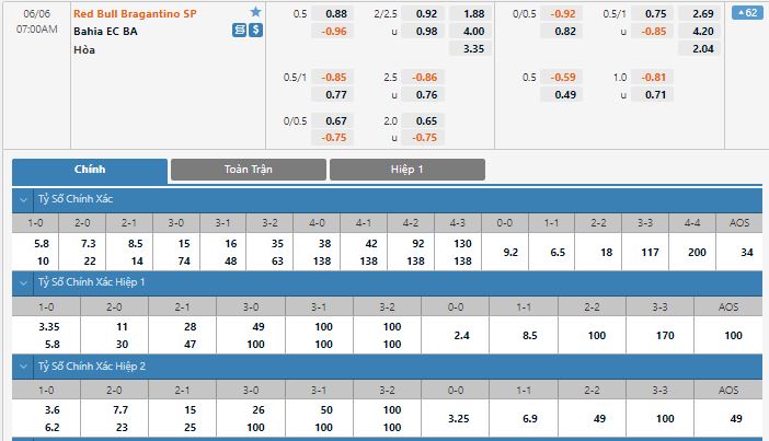 Bảng tỷ lệ kèo trực tuyến trận đấu Bragantino vs Bahia: