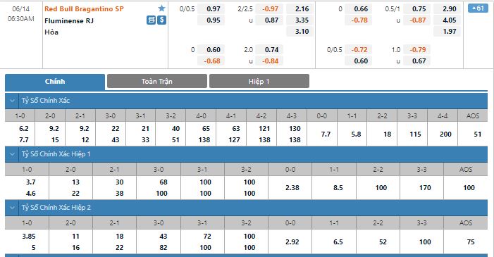 Bảng tỷ lệ kèo trực tuyến trận đấu Bragantino vs Fluminense:
