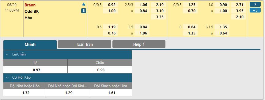 Bảng tỷ lệ kèo trực tuyến trận đấu Brann vs ODD Ballklubb:
