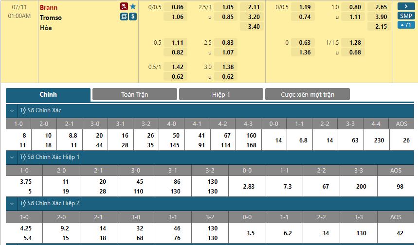 Bảng tỷ lệ kèo trực tuyến trận đấu Brann vs Tromso: