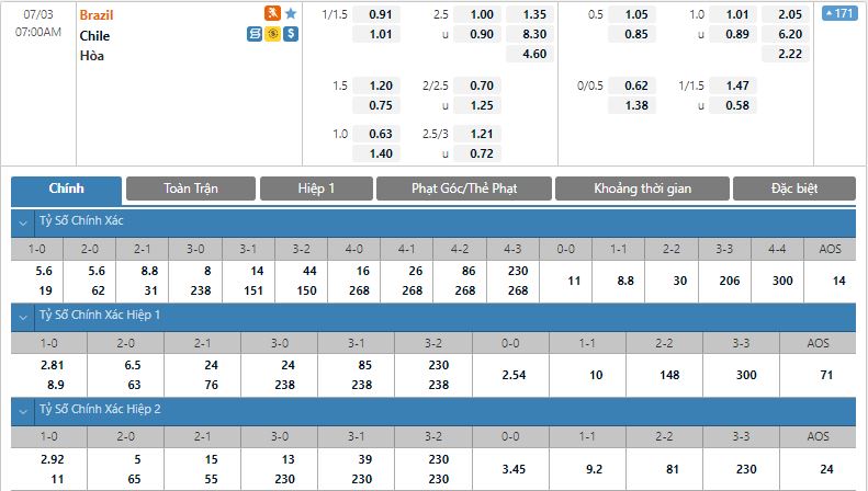 Bảng tỷ lệ kèo trực tuyến trận đấu Brazil vs Chile