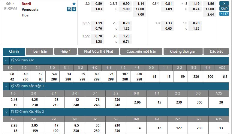 Bảng tỷ lệ kèo trực tuyến trận đấu Brazil vs Venezuela