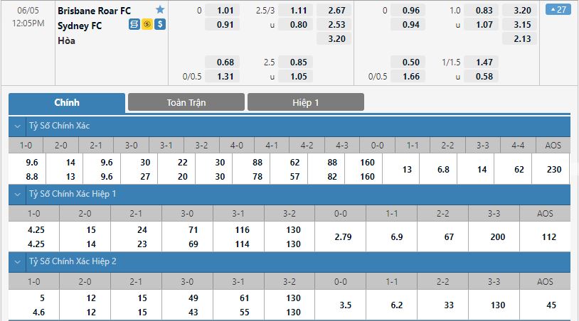 - Kèo tỉ số hiệp 1: Brisbane Roar 1-1 Sydney FC