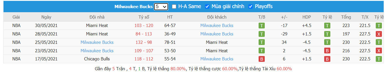 Từ tháng 12/2016 cho tới nay hai đội đã gặp nhau tổng cộng 10 lần, trong đó cũng có 4 trận diễn ra trên sân Fiserv Forum của Milwaukee Bucks. Ở trận đấu tới với lợi thế được ra sân ngay trên sân nhà, bầy Hươu đực Milwaukee Bucks càng được đánh giá cao hơn khi đã giành được tới 7 chiến thắng trên cả thảy 10 trận đối đầu kể trên. Trong số đó ở trận so tài gần nhất của hai bên diễn ra trên sân của Brooklyn Nets nhưng Milwaukee Bucks cũng đã giành được chiến thắng 118-99 chung cuộc. Như vậy Milwaukee Bucks vẫn là sự lựa chọn sáng hơn ở trận này khi mà đội chủ nhà đã toàn thắng về kèo theo TLCA trong cả 4 trận ra sân gần nhất.