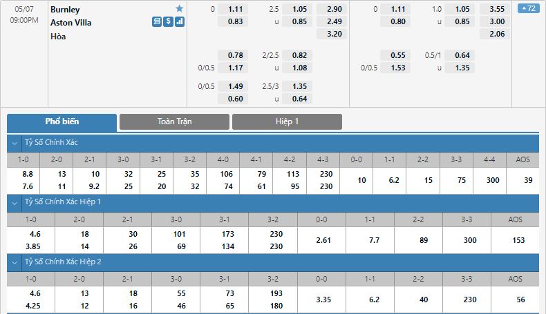 - Kèo tỉ số hiệp 2: Burnley 1-0 Aston Villa