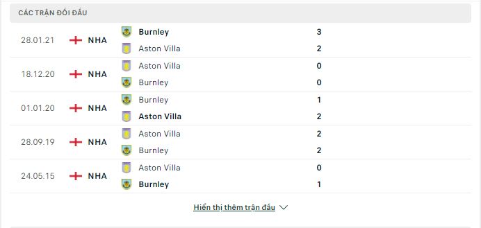 Thành tích đối đầu Burnley vs Aston Villa
