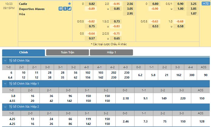 Bảng tỷ lệ kèo trực tuyến trận đấu Cadiz vs Alaves:
