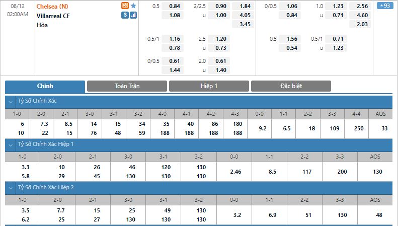 Bảng tỷ lệ kèo bóng đá Chelsea vs Villarreal