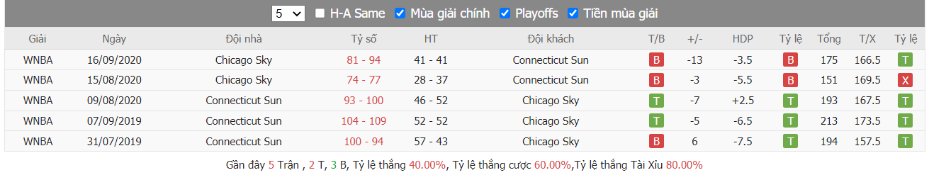 Thành tích đối đầu Chicago Sky vs Connecticut Sun