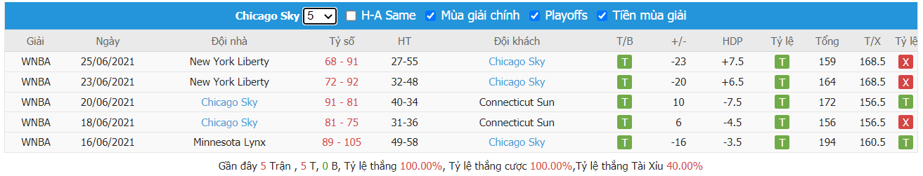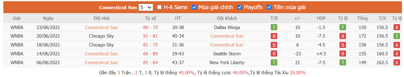 Phong độ gần đây Chicago Sky vs Connecticut Sun
