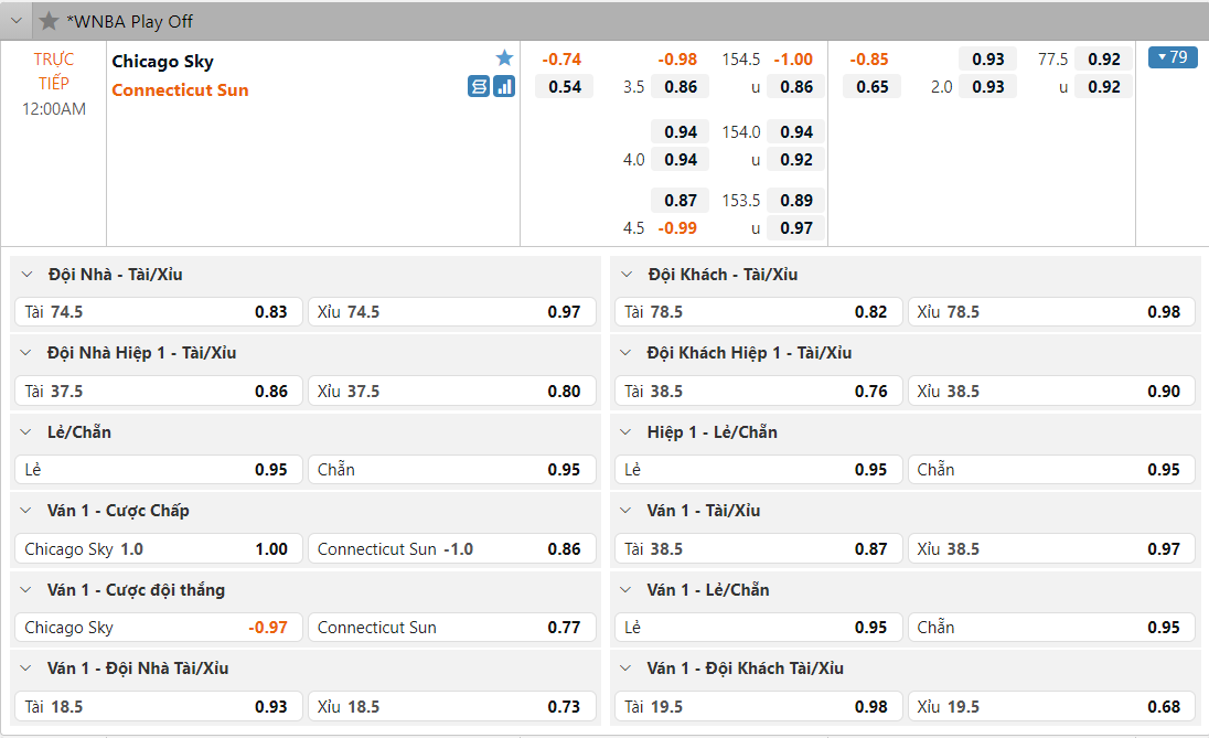 Bảng tỷ lệ kèo Chicago Sky vs Connecticut Sun