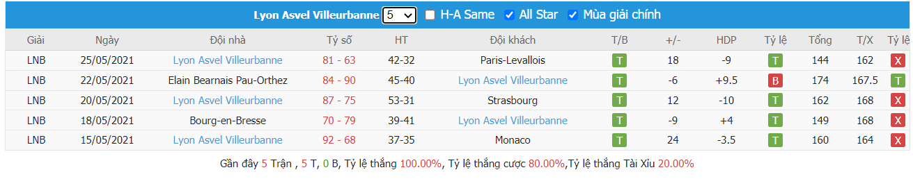 Một lần nữa đối đầu với chính “bại tướng” ở vòng đấu trước ngay trên sân nhà, ưu thế chắc hẳn đang nghiêng khá nhiều về phía đội khách khi mà LDLC Asvel Lyon-Villeurbanne đã giành được tới 7 chiến thắng trên cả thảy 8 lần chạm trán gần nhất của hai đội kể từ 2/2018 cho đến nay, với 5 lần trong số đó được ra sân ngay trên sân nhà của LDLC Asvel Lyon-Villeurbanne. Như vậy mặc dù không có được lợi thế ra sân ngay trên sân nhà ở trận tới, nhưng LDLC Asvel Lyon-Villeurbanne vẫn hoàn toàn là sự lựa chọn sáng hơn cả nhất là khi mà LDLC Asvel Lyon-Villeurbanne đã mang đến niềm vui cho giới đầu tư trong 3 trên 5 lần ra sân đã qua.