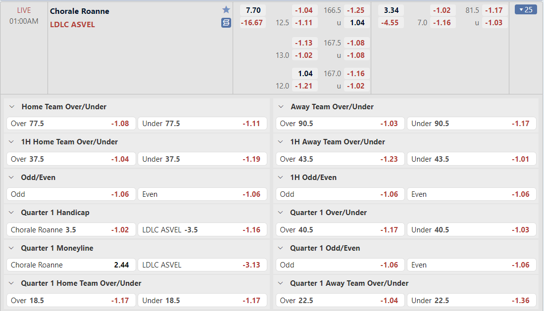 Bảng tỷ lệ kèo Chorale Roanne Basket vs LDLC Asvel Lyon-Villeurbanne