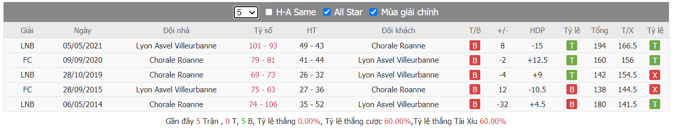 Thành tích đối đầu Chorale Roanne Basket vs LDLC Asvel Lyon-Villeurbanne