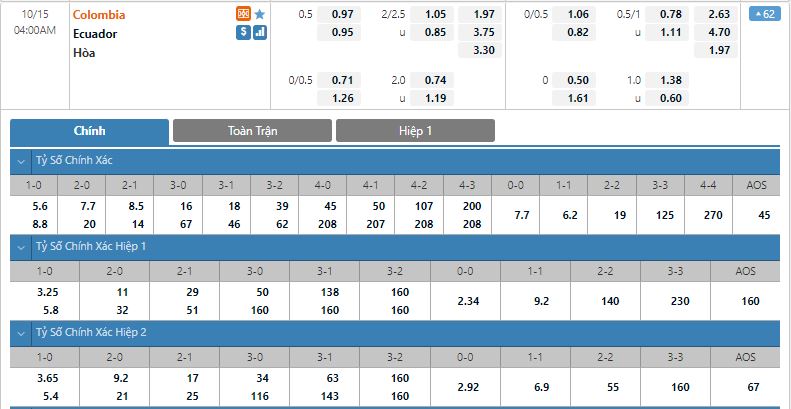 - Kèo tỉ số hiệp 1: Colombia 0-0 Ecuador