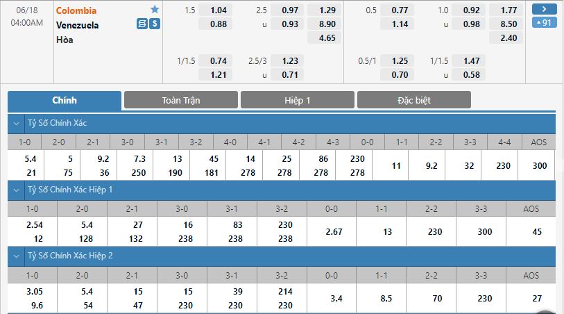 Bảng tỷ lệ kèo bóng đá Colombia vs Venezuela