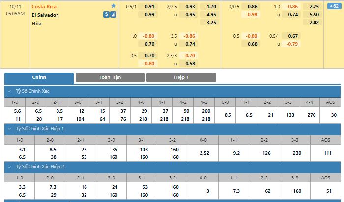 Bảng tỷ lệ kèo trực tuyến trận đấu Costa Rica vs El Salvador: