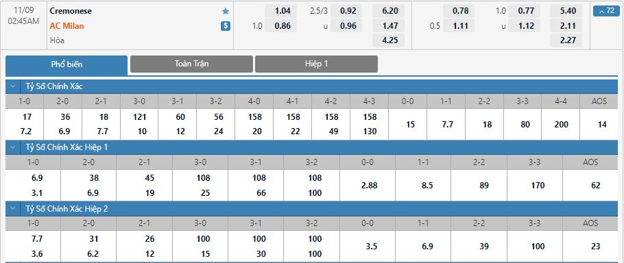 Bảng tỷ lệ kèo bóng đá Cremonese vs AC Milan