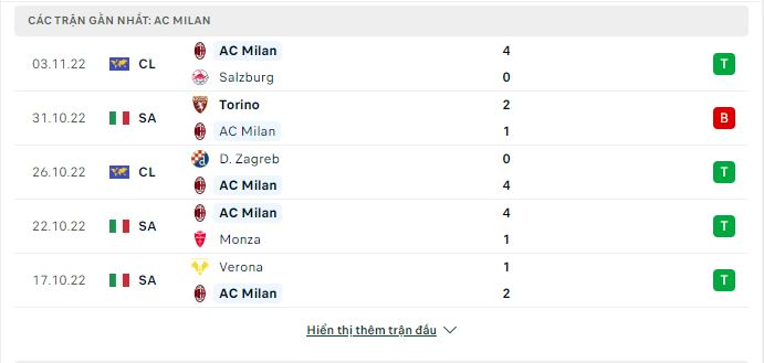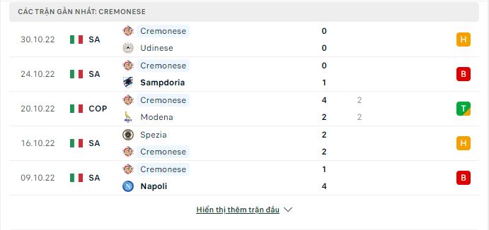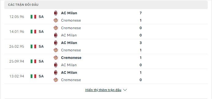 Thống kê phong độ gần đây Cremonese vs AC Milan
