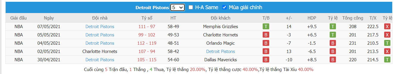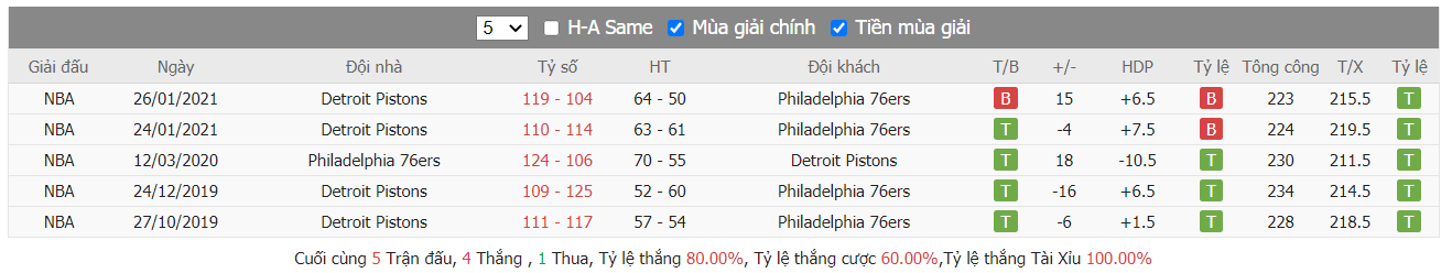 Thành tích đối đầu Detroit Pistons vs Philadelphia 76ers