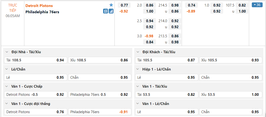 Bảng tỷ lệ kèo Detroit Pistons vs Philadelphia 76ers